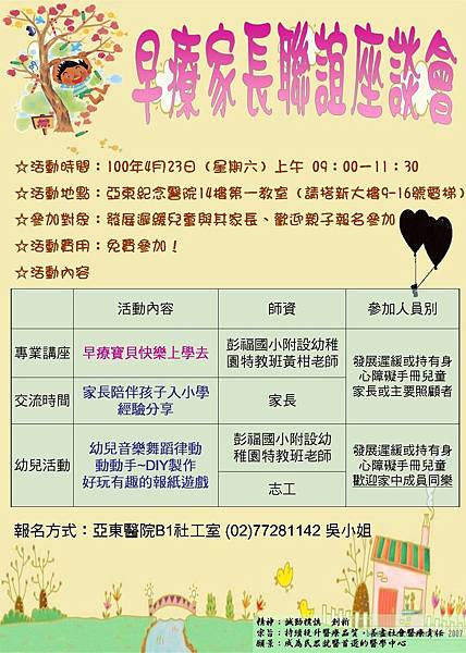 ☆活動地點:亞東紀念醫院14樓第一教室(請搭新大樓9-16號電梯)